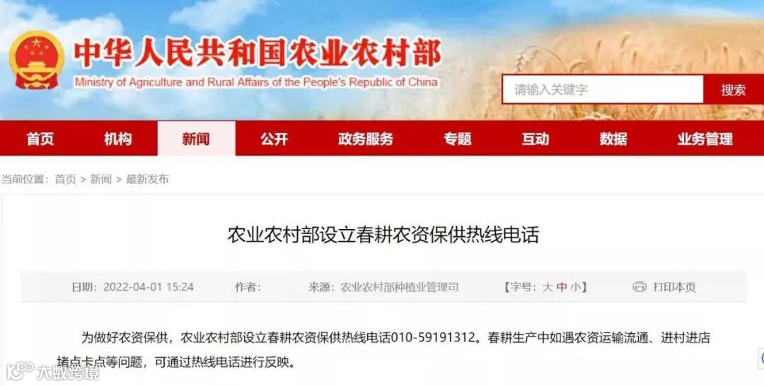 为做好农资保供,农业农村部设立春耕农资保供热线电话010-59191312。春耕生产中如遇农资运输流通、进村进店堵点卡点等问题,可通过热线电话进行反映。 严禁随意堵路封路,保证公路网顺畅运行,坚决不允许出现农资运输车辆“进村难”“进出铁路货场难”“化肥装卸作业人员出行作业难”,高速公路“上得来、下不去”以及农机具跨区作业转运难等问题。