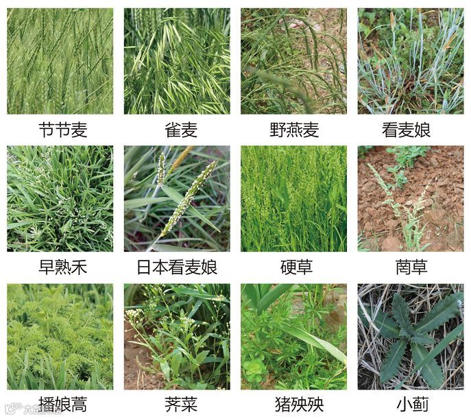 冬小麦主要杂草有30种左右,禾本科杂草主有野燕麦、看麦娘、日本看麦娘、大穗看麦娘、雀麦、节节麦、早熟禾、硬草、棒头草、罔草、多花黑麦草等。
