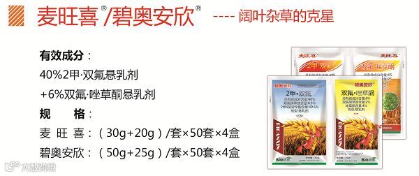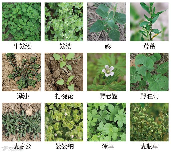 阔叶杂草主要有荠菜、播娘蒿、猪殃殃、繁缕、牛繁缕、婆婆纳、麦家公、麦瓶草、刺儿菜、雀舌草、大巢菜等。