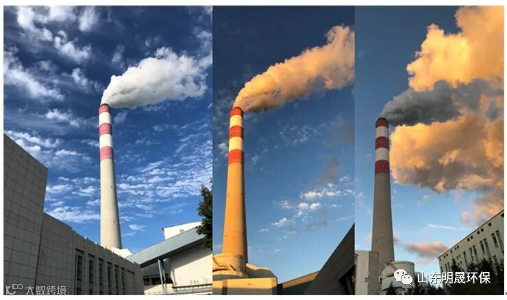 烟气在烟囱口排入大气的过程中因温度降低,烟气中部分汽态水和污染物会发生凝结,在烟囱口形成雾状水汽,雾状水汽会因天空背景色和天空光照、观察角度等原因发生颜色的细微变化,形成“有色烟羽”,通常为白色、灰白色或蓝色等颜色。