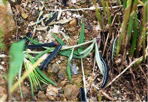 玉米粘虫以幼虫暴食玉米叶片,严重发生时,短期内吃光叶片,造成减产甚至绝收。为害症状主要以幼虫咬食叶片。1~2龄幼虫取食叶片造成孔洞,3龄以上幼虫危害叶片后呈现不规则的缺刻,暴食时,可吃光叶片。大发生时将玉米叶片吃光,只剩叶脉,造成严重减产,甚至绝收。当一块田玉米被吃光,幼虫常成群列纵队迁到另一块田为害,故又名“行军虫”。一般地势低、玉米植株高矮不齐、杂草丛生的田块受害重。