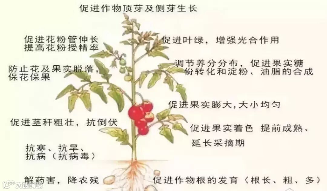 加速作物生长,提高产量。促进作物后期生殖生长,提高产品品质。打破休眠,促进发育,提高发芽率。另外,可以促进植物新陈代谢,降低药害对植物的不良影响……