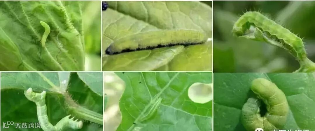 上:小菜蛾、菜青虫、棉铃虫;下:造桥虫、瓜绢螟、甜菜夜蛾