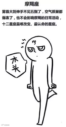 射手同样是心态积极、天生乐观的星座,但他们有个特点是比较容易受别人影响。所以尽管他们对雾霾本身不会有太多想法,可假如和朋友讨论的多了,就容易受别人情绪的感染,也变得忧心忡忡起来,并且可能对一些不必要的事情过分纠结。所以提醒射手在这样的特殊时期,还是少和负面情绪较重的小伙伴一起玩耍啦。