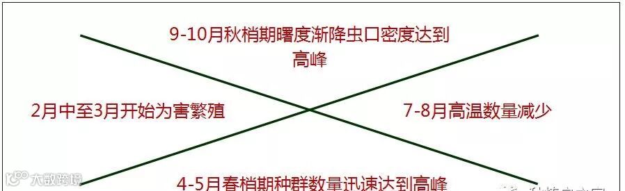 三:每次新梢转绿期为红蜘蛛大量繁殖、猖獗危害的高峰,而每次高峰又与当时的气温相关。一般在春梢期(4~5月)和秋梢期(9~10月)形成两个危害高峰期。