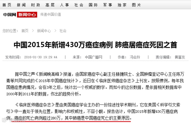 我国肺癌发病率每年增长26.9%,肺癌已成为我国首位恶性肿瘤死亡原因,预计到2025年,我国肺癌病人将达到100万,成为世界第一肺癌大国。