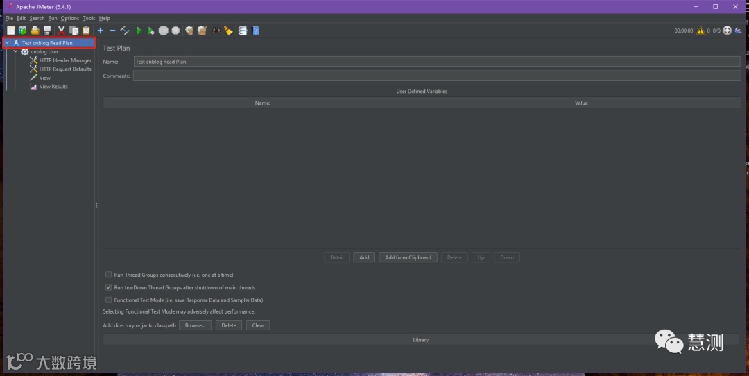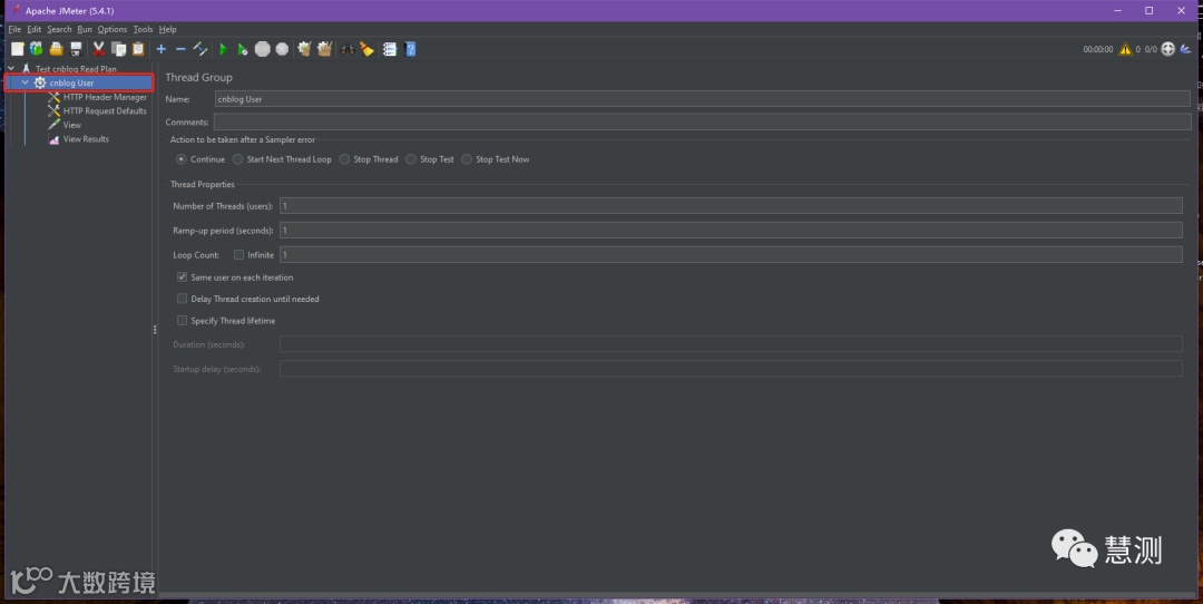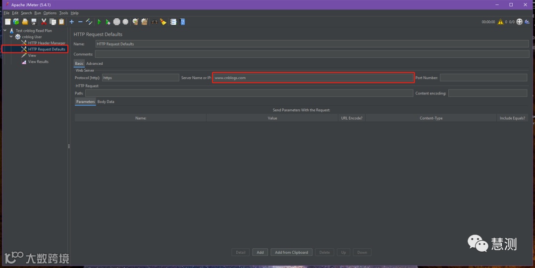 (2)测试地址为:cnblogs网站的地址,即:Sever Name or IP:www.cnblogs.com,但又由于前面的步骤中已经对该值在HTTP请求默认值管理器进行了配置,故此处可为空不填写