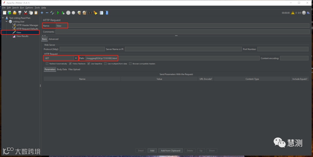 5、选中线程组,添加一个HTTP Request元件,然后将其重命名为:View。如下图所示: