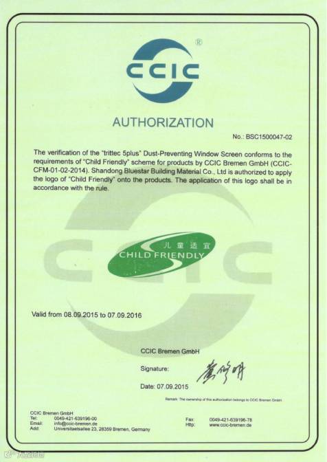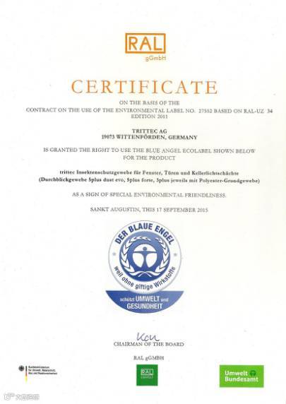 环保性也是德国trittec始终关注的重点,除了能够有效阻尘防霾外,纱窗也不含有任何有害物质,全球最为严苛的认证之一德国蓝天使环保认证在2015年8月就出具了相关的证书。CCIC更是将trittec纱窗纳入了儿童适宜产品的行列。