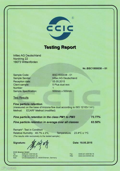 除了使用专业的设备外,检测机构的资质也非常重要。为了进一步认证产品的有效性,trittec进入中国以后,立即请来唯一国际上认可的国字头检验认证机构中国检验认证集团CCIC对产品进行全面检测,trittec也以优异的表现荣获了CCIC颁发的防微尘认证证书。