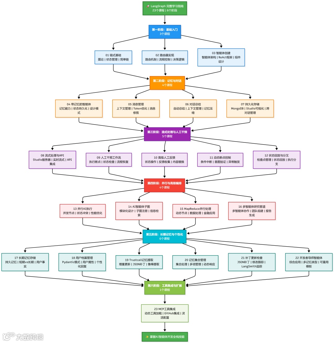 这是一套全面系统的 LangGraph 免费公开课,基础篇 24 个章节,高级篇16个章节,通过循序渐进的 Jupyter 实战脚本,从基础概念到高级应用,全面展示如何使用 LangGraph 这一强大框架构建可扩展的、企业级的智能体和AI工作流。