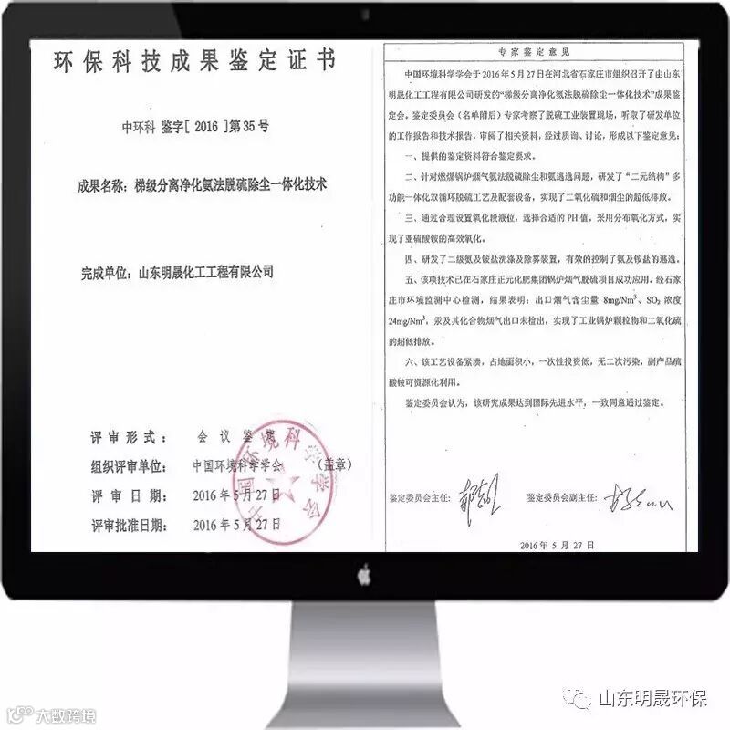 2016年5月27日,中国环境科学学会在河北省石家庄市组织召开 “梯级分离净化氨法脱硫除尘一体化技术”成果鉴定会。此项技术由山东明晟化工工程有限公司研发。