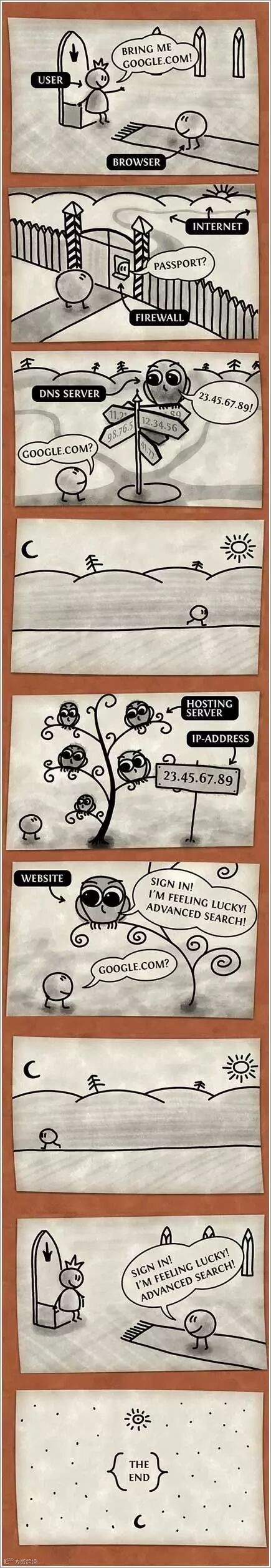 国外也有网友根据浏览器的工作原理绘制了几张工作流程图,方便大家通过简易的图片来了解这个辛苦的过程: