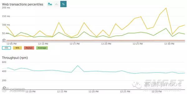 我们可以使用APMs(例如New Relic或AppDynamics)来衡量这些指标。使用这些工具,你可以在主报告仪表板中将平均响应时间与昨天的甚至上周的直接进行对比。这有助于我们观察新的部署是否会影响到我们的应用程序。你可以看到网络传输的百分比,测量HTTP完成请求需要多长时间。