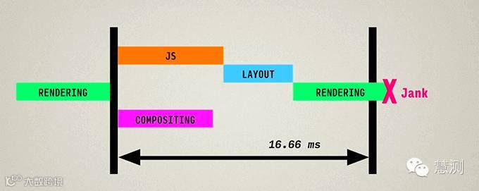 所以,如果网页动画能够做到每秒60帧,就会跟显示器同步刷新,达到最佳的视觉效果。这意味着,一秒之内进行60次重新渲染,每次重新渲染的时间不能超过16.66毫秒。