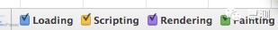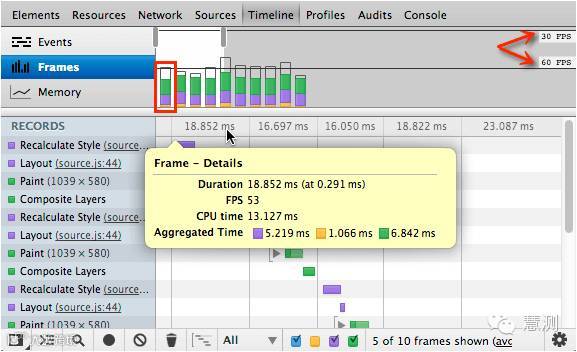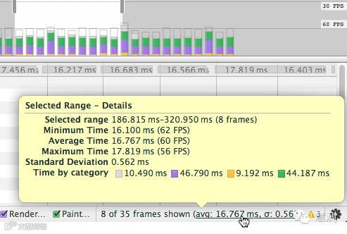 下面的一条是60FPS,低于这条线,可以达到每秒60帧;上面的一条是30FPS,低于这条线,可以达到每秒30次渲染。如果色柱都超过30FPS,这个网页就有性能问题了。