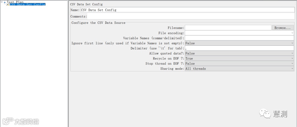 1、关于CSV Data Set Config配置元件,如下图所示:
