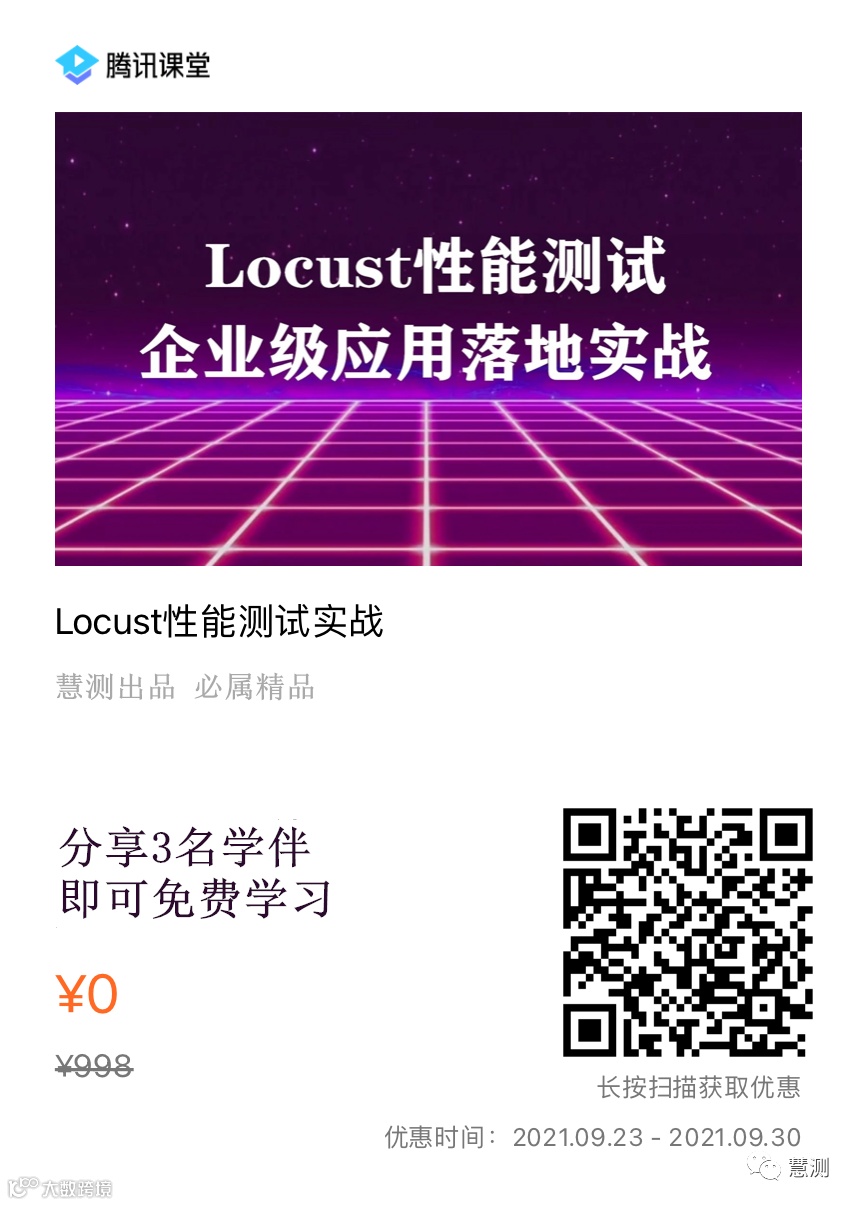 真正用过才知道,Locust在很多方面确实比较优秀,但市面上系统讲解Locust的学习资料比较少,今天给大家推荐一套限时免费的Locust性能实战课程,有兴趣的小伙伴可以报名学习一下,真的很不错,强烈推荐!