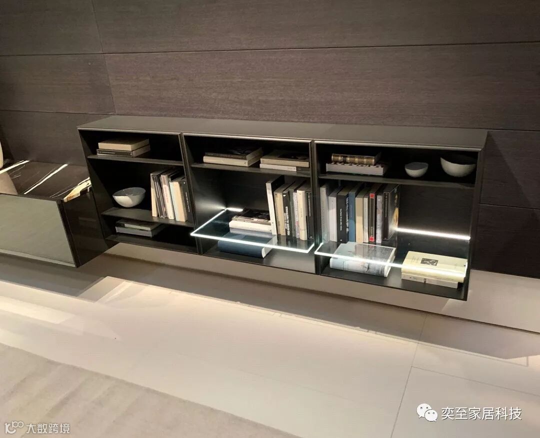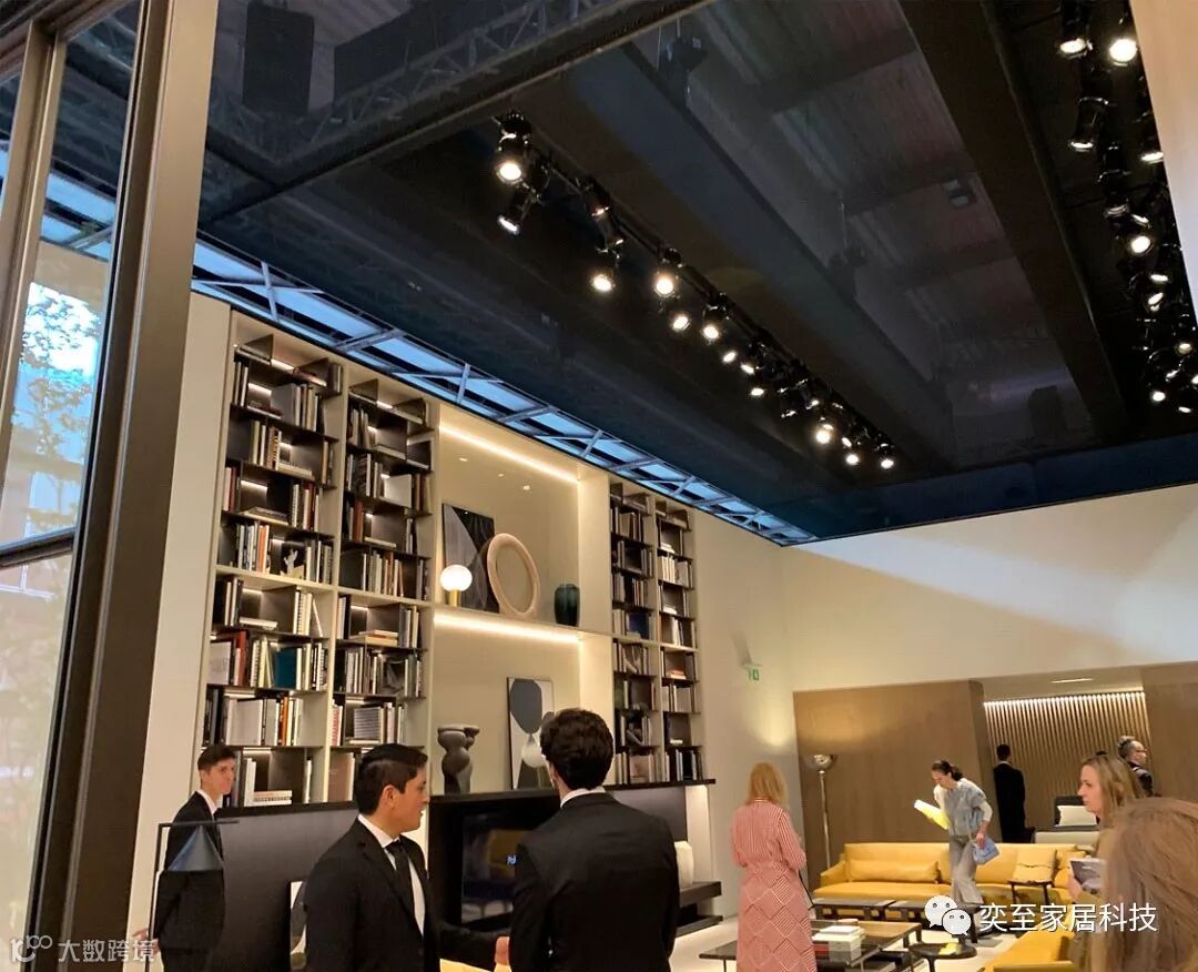 Poliform 的展位延续了一贯的沉稳高端的风格,在展厅的中心位置,布置了一个5米高的大书柜,用了多种线条灯组合来打造Poliform style 的空间美学。