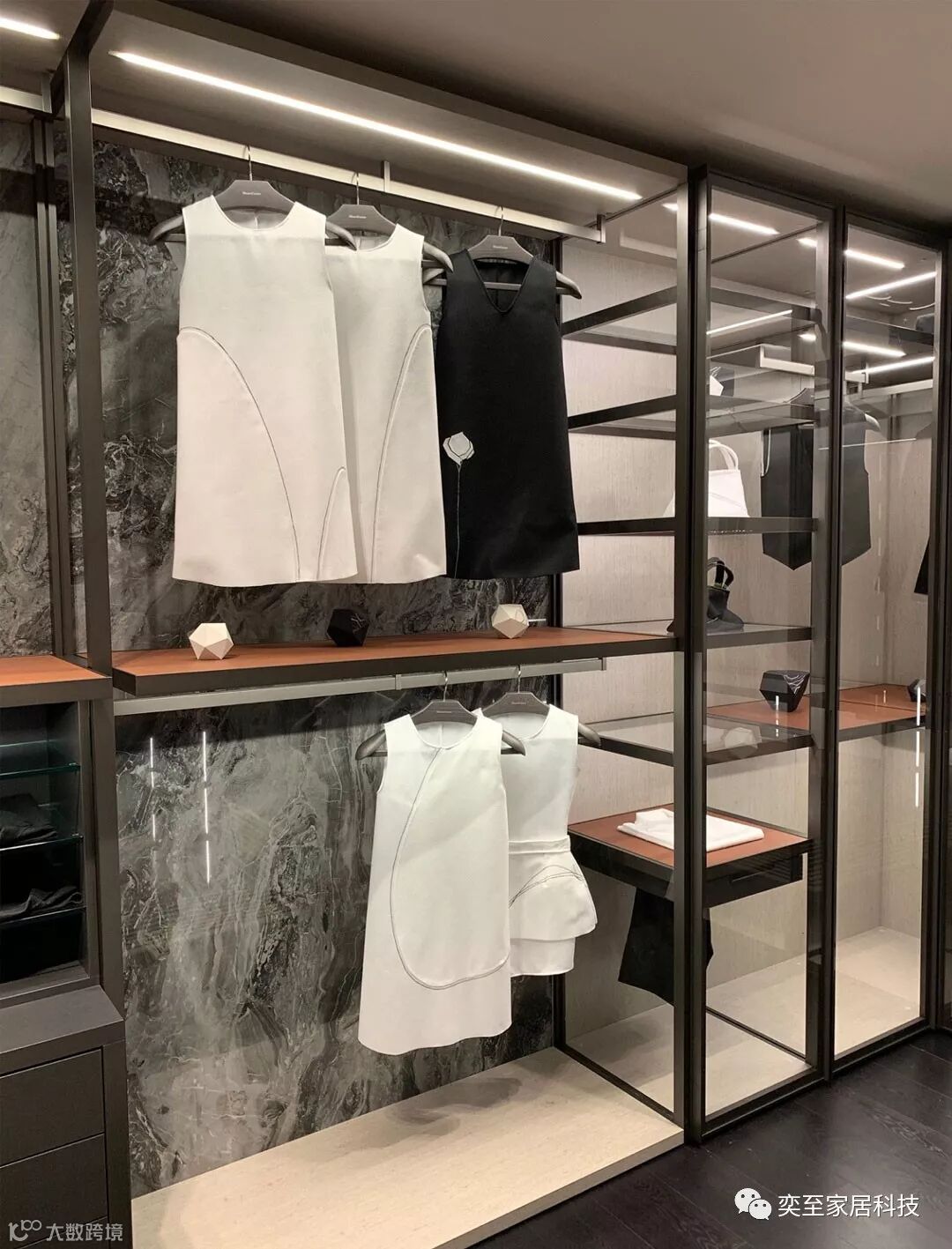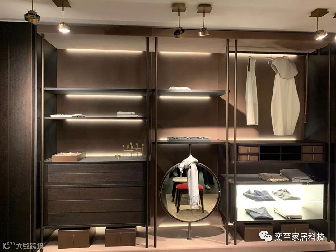 在今年的展位上,以金属铝框门为核心,线条灯与皮革收纳为装饰打造的衣帽间吸引了众多观众的眼球,古典优雅中带着现代时尚的气息,小编猜测必将引领未来2年全球的定制家具设计风格。