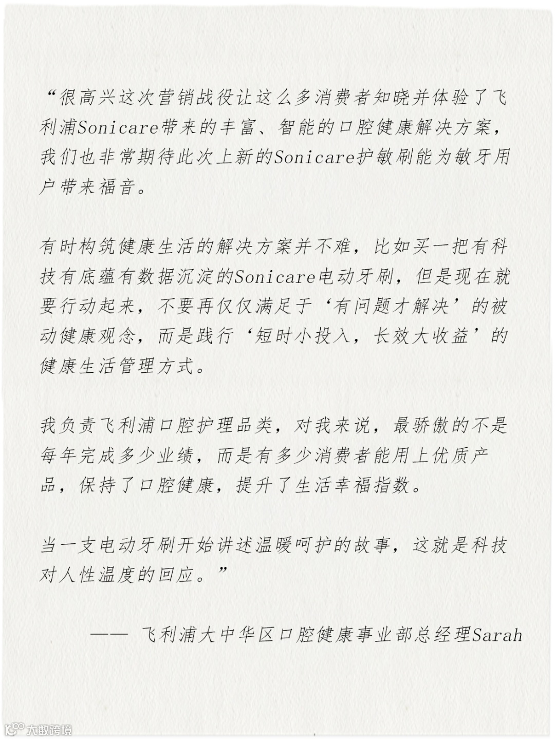 而品牌方的选择标准并不是粗暴的“流量变现”,更多来自双方的优势共振;消费者诟病一些劣质电动牙刷清洁不到位或者暴力清洁,而飞利浦Sonicare全新产品护敏刷希望能带给消费者新的认知和惊喜,飞利浦护敏刷在带给你高效清洁的同时也可以很温柔,呵护你的敏感牙齿。而如何连同全球代言人,把对科学护齿的教育、飞利浦Sonicare护敏刷的卖点讲清楚成了本次营销战役的重点。