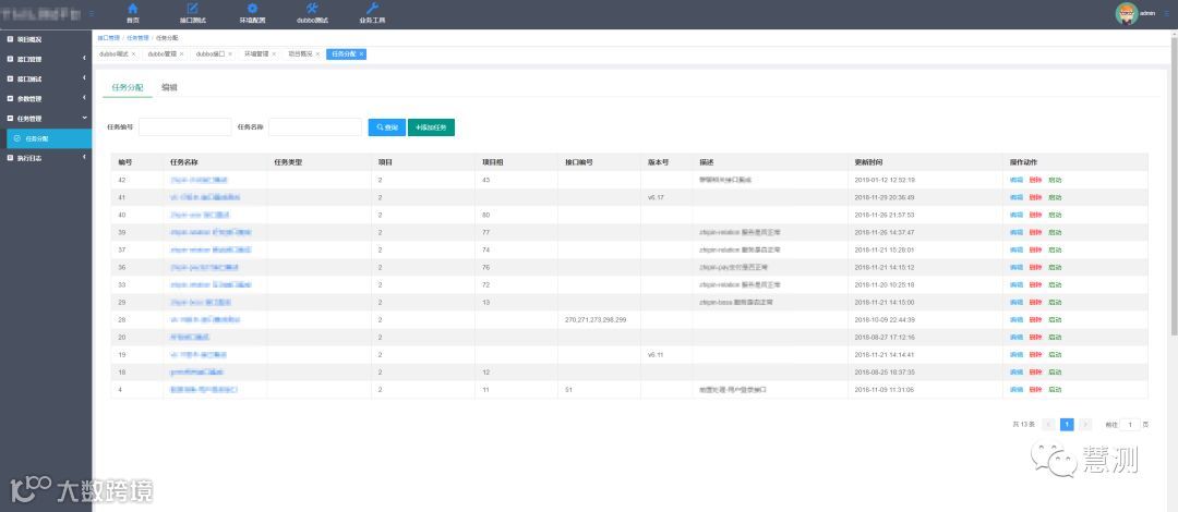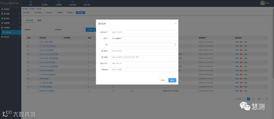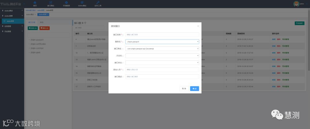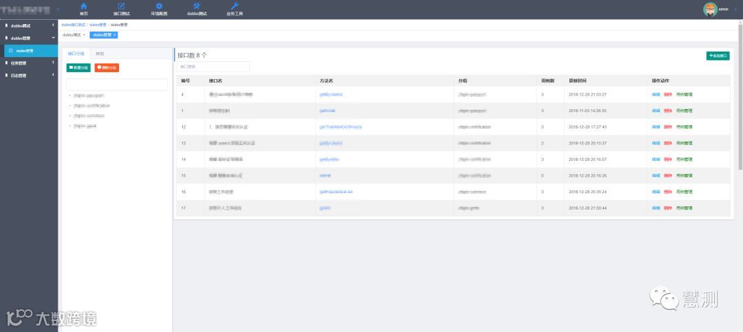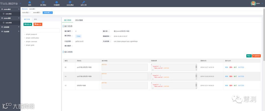整个界面功能分为dubbo接口调试-接口管理-用例管理-任务管理-日志管理,