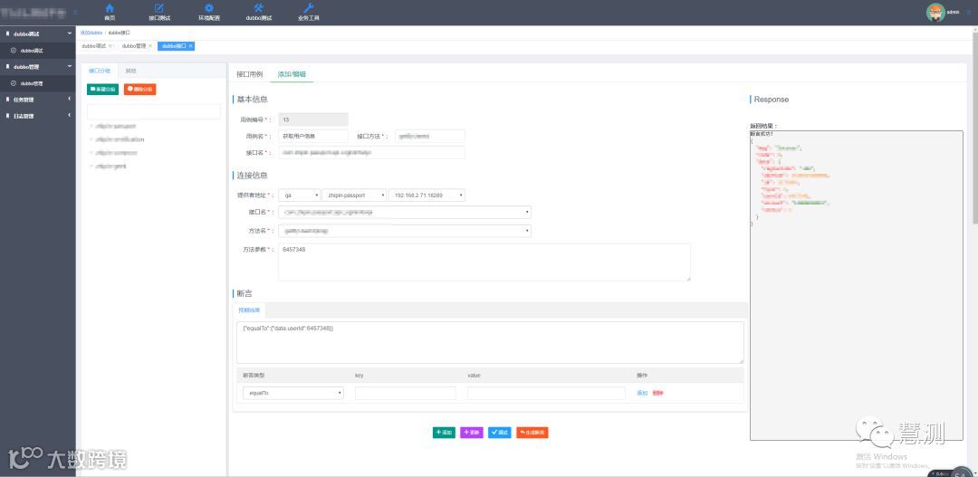 用例添加、编辑和调试页,这里边我们一样可以先进行用例调试,调试成功之后我们再添加或者编辑用例,由于dubbo接口业务更接口增删改查操作,所有请求数据应该更容易准备,也不会变化太大,所以我们没有前后置处理功能。
