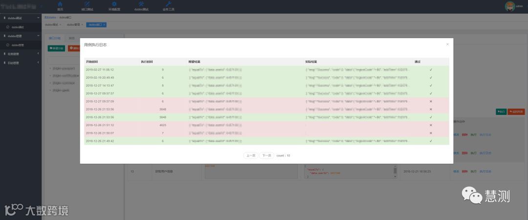执行日志页,该用例下的执行日志,每次执行结果都能在日志中能够查看,是否执行成功,绿色表示成功,红色表示失败。