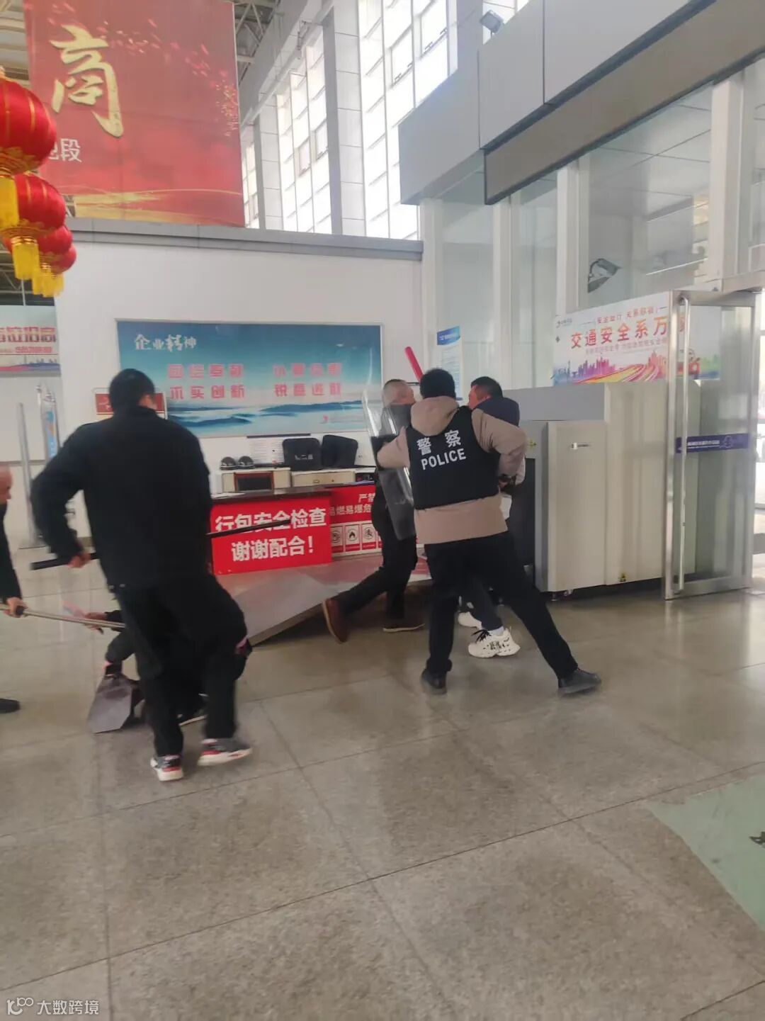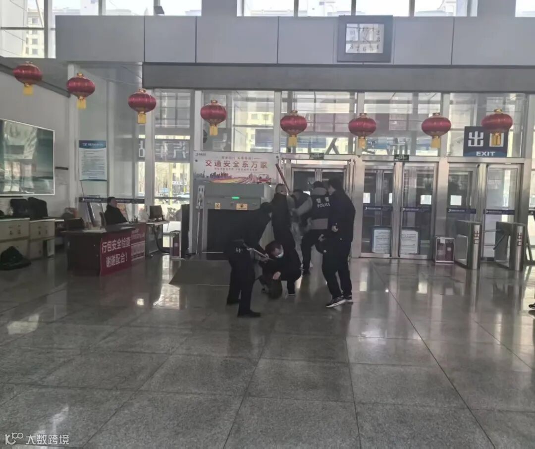 2月20日下午16时左右,三品安检人员在安检时发现两名乘客携带管制刀具,工作人员要求对其刀具进行暂存,乘客情绪激动不配合工作并与工作人员发生肢体冲突,在候车厅内持刀袭击乘客,对其他乘客人身安全造成严重威胁。