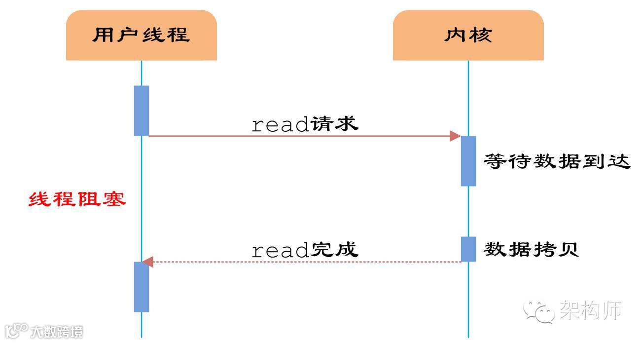 如图1所示,用户线程通过系统调用read发起IO读操作,由用户空间转到内核空间。内核等到数据包到达后,然后将接收的数据拷贝到用户空间,完成read操作。