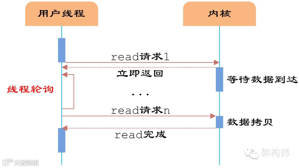 如图2所示,由于socket是非阻塞的方式,因此用户线程发起IO请求时立即返回。但并未读取到任何数据,用户线程需要不断地发起IO请求,直到数据到达后,才真正读取到数据,继续执行。