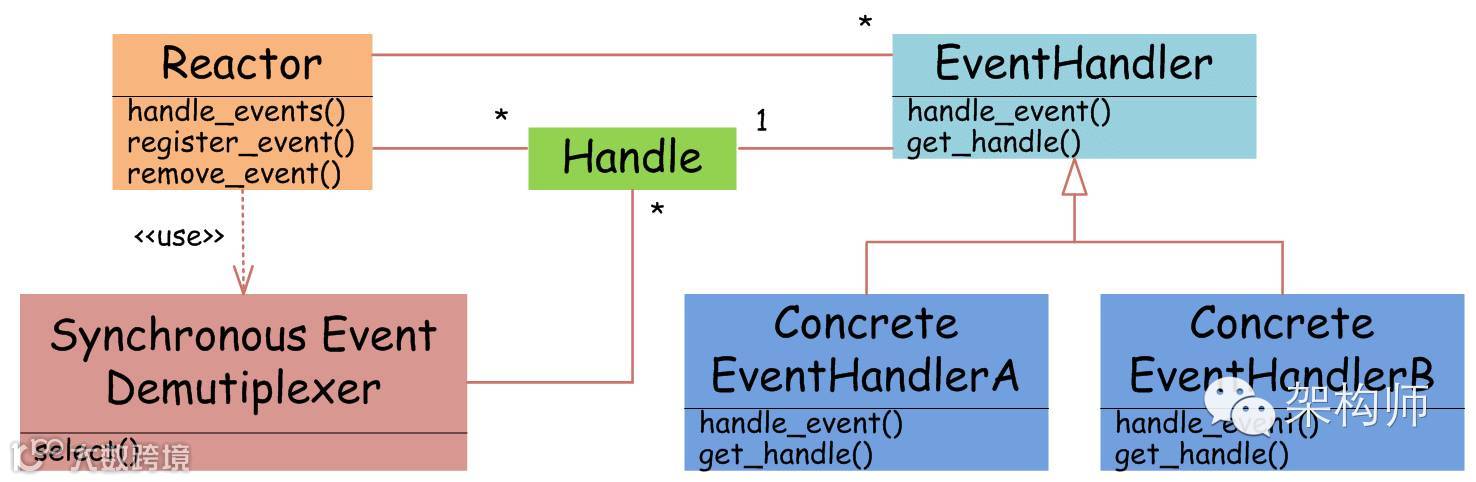 如图4所示,EventHandler抽象类表示IO事件处理器,它拥有IO文件句柄Handle(通过get_handle获取),以及对Handle的操作handle_event(读/写等)。继承于EventHandler的子类可以对事件处理器的行为进行定制。Reactor类用于管理EventHandler(注册、删除等),并使用handle_events实现事件循环,不断调用同步事件多路分离器(一般是内核)的多路分离函数select,只要某个文件句柄被激活(可读/写等),select就返回(阻塞),handle_events就会调用与文件句柄关联的事件处理器的handle_event进行相关操作。