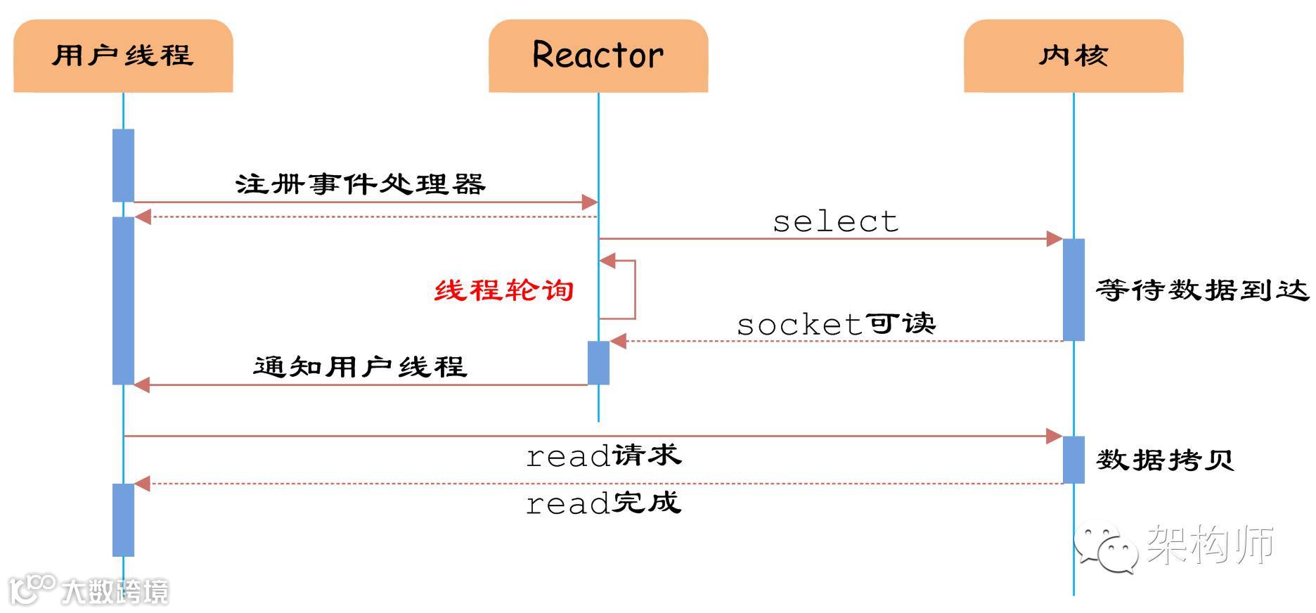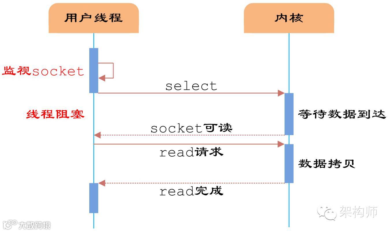 如图3所示,用户首先将需要进行IO操作的socket添加到select中,然后阻塞等待select系统调用返回。当数据到达时,socket被激活,select函数返回。用户线程正式发起read请求,读取数据并继续执行。