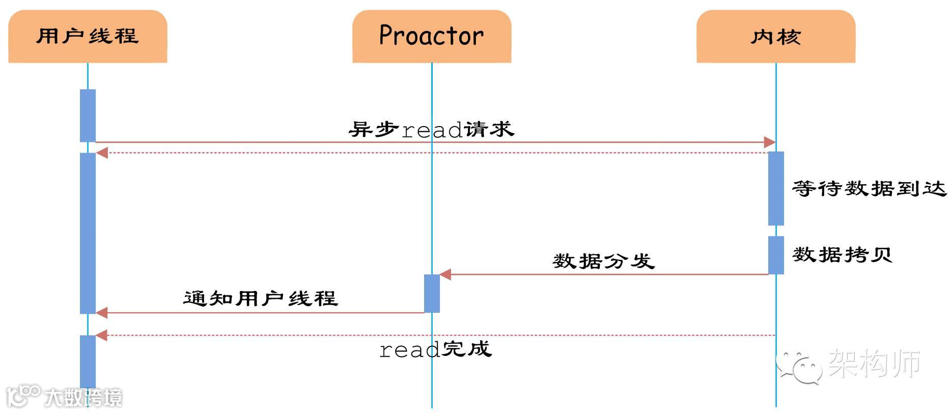 如图7所示,异步IO模型中,用户线程直接使用内核提供的异步IO API发起read请求,且发起后立即返回,继续执行用户线程代码。不过此时用户线程已经将调用的AsynchronousOperation和CompletionHandler注册到内核,然后操作系统开启独立的内核线程去处理IO操作。当read请求的数据到达时,由内核负责读取socket中的数据,并写入用户指定的缓冲区中。最后内核将read的数据和用户线程注册的CompletionHandler分发给内部Proactor,Proactor将IO完成的信息通知给用户线程(一般通过调用用户线程注册的完成事件处理函数),完成异步IO。