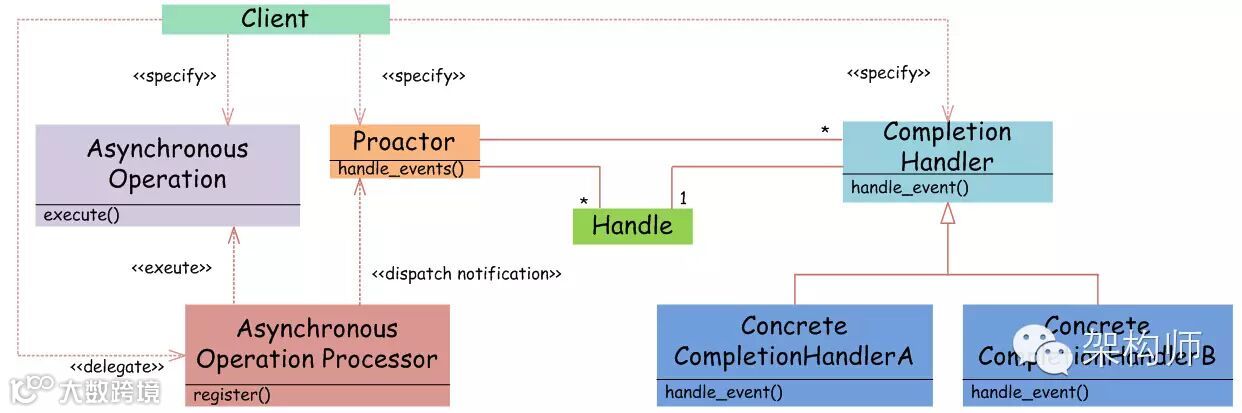 如图6,Proactor模式和Reactor模式在结构上比较相似,不过在用户(Client)使用方式上差别较大。Reactor模式中,用户线程通过向Reactor对象注册感兴趣的事件监听,然后事件触发时调用事件处理函数。而Proactor模式中,用户线程将AsynchronousOperation(读/写等)、Proactor以及操作完成时的CompletionHandler注册到AsynchronousOperationProcessor。AsynchronousOperationProcessor使用Facade模式提供了一组异步操作API(读/写等)供用户使用,当用户线程调用异步API后,便继续执行自己的任务。AsynchronousOperationProcessor 会开启独立的内核线程执行异步操作,实现真正的异步。当异步IO操作完成时,AsynchronousOperationProcessor将用户线程与AsynchronousOperation一起注册的Proactor和CompletionHandler取出,然后将CompletionHandler与IO操作的结果数据一起转发给Proactor,Proactor负责回调每一个异步操作的事件完成处理函数handle_event。虽然Proactor模式中每个异步操作都可以绑定一个Proactor对象,但是一般在操作系统中,Proactor被实现为Singleton模式,以便于集中化分发操作完成事件。