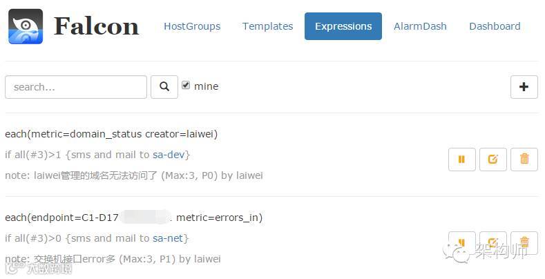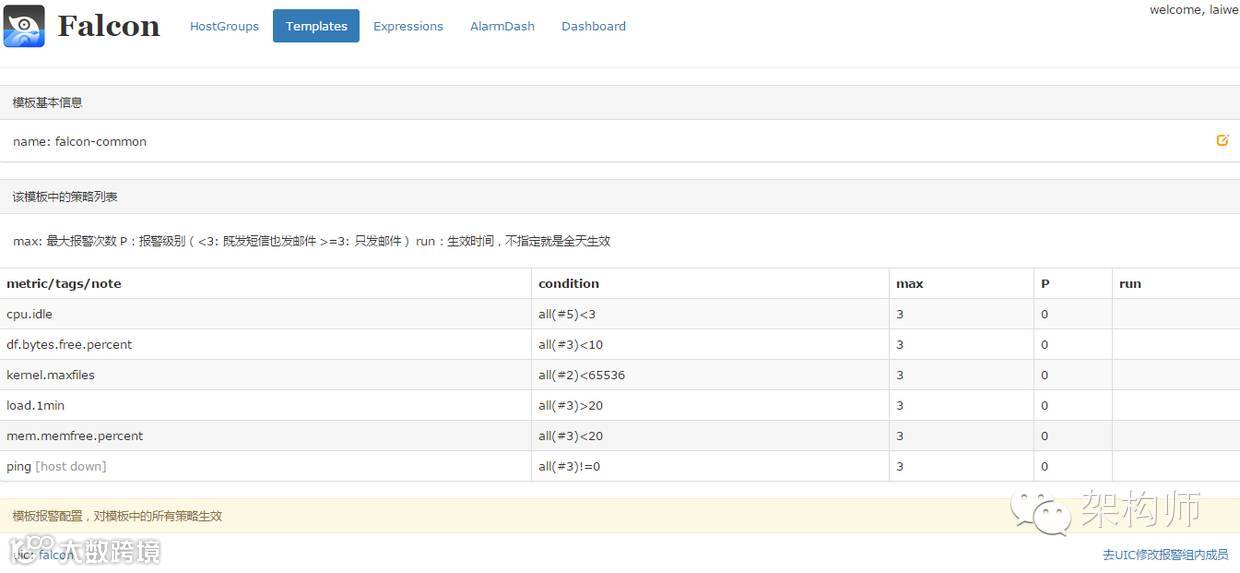 这是host group的管理页面,可以和服务树结合,机器进出服务树节点,相关的模板会自动关联或者解除。这样服务上下线,都不需要手动来变更监控,大大提高效率,降低遗漏和误报警。