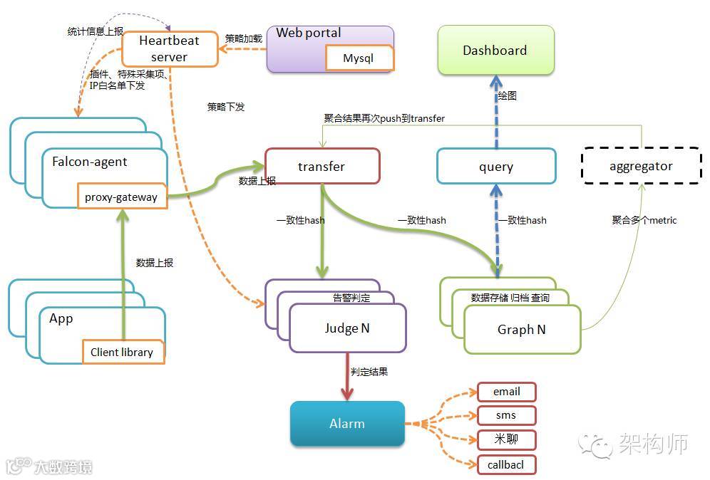 transfer转发到judge的每条数据,都会触发相关策略的判定,来决定是否满足报警条件,如果满足条件,则会发送给alarm,alarm再以邮件、短信、米聊等形式通知相关用户,也可以执行用户预先配置好的callback地址。