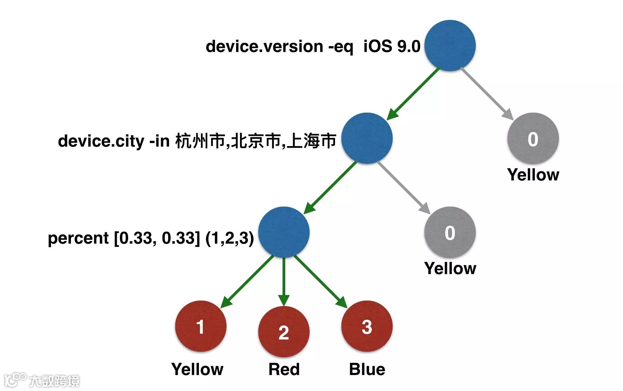 哈希运算,则是使用设备ID,条件名称和当前节点深度三个因素组合成一个因子,并对该因子进行0-10,000的哈希,通过哈希结果可知当前设备落入那一段区间内。根据给定的子节点和比例关系决定落入哪一棵子树。