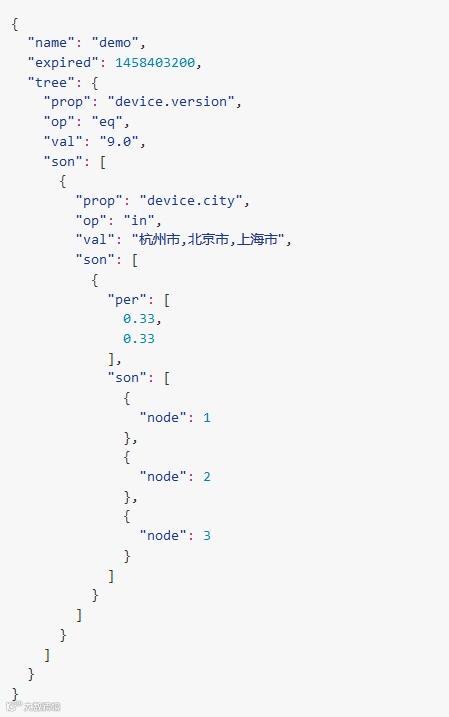 通过一段JSON描述这棵实验条件树,再利用配置中心的动态能力把数据动态下发到端,从而实现了实验条件动态化。