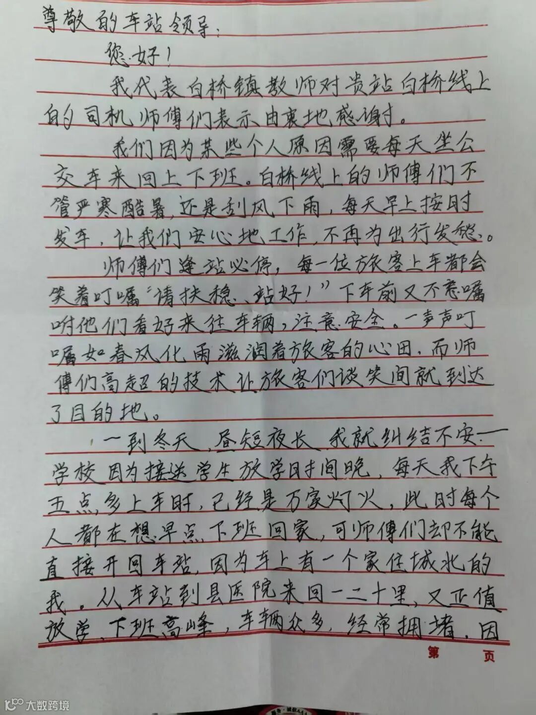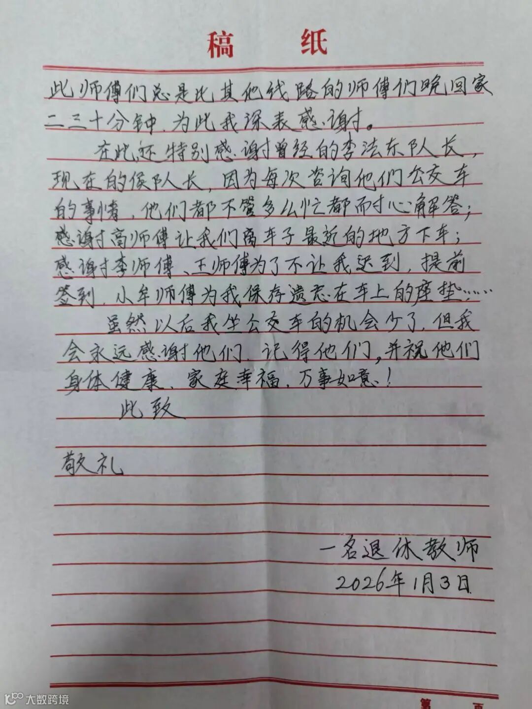 一纸手写感谢信,字里行间皆是情。近日,山商交运收到了一位退休教师的亲笔感谢信,笔墨间满是对白桥线公交师傅们的感激,也让我们看到了山商交运服务里藏着的温暖与用心。