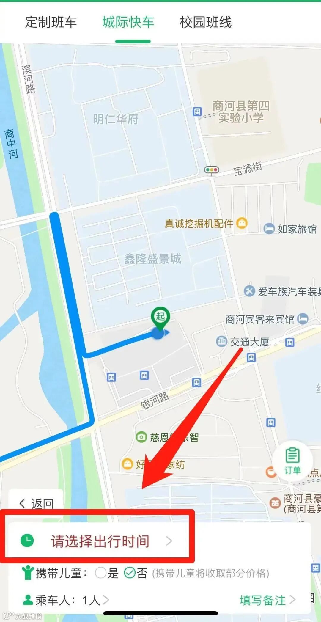 ⑥点击【请选择出行时间】,选择出发时间;