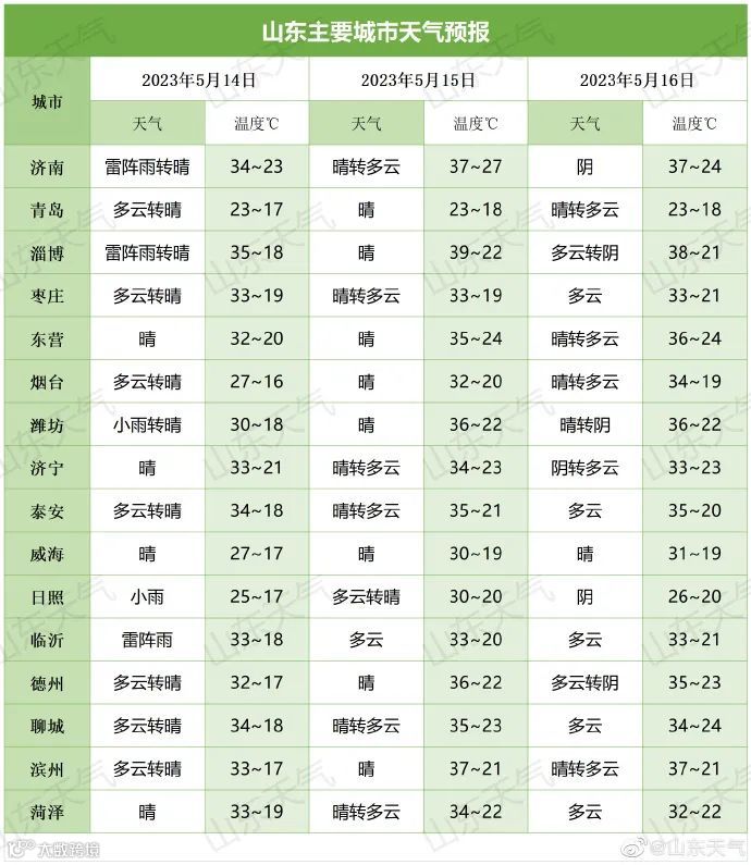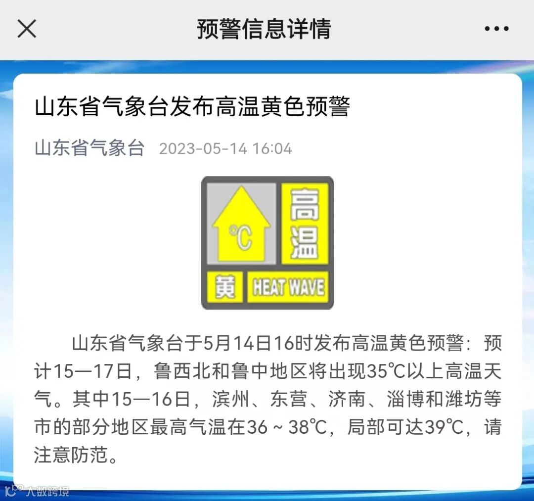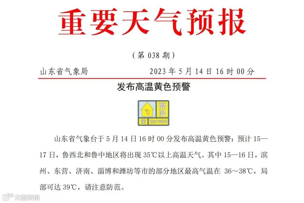 其中15—16日,滨州、东营、济南、淄博和潍坊等市的部分地区最高气温在36~38℃,局部可达39℃,请注意防范。