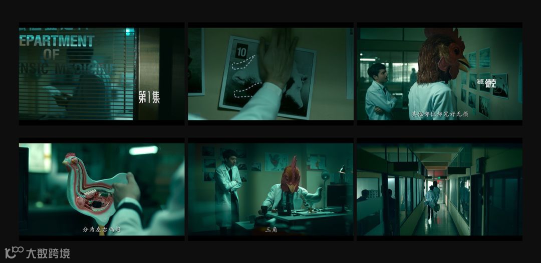 第一集,用绿色影调给影片先下个悬疑的大基调。最后走廊的一抹红为下一个线索留下暗示。