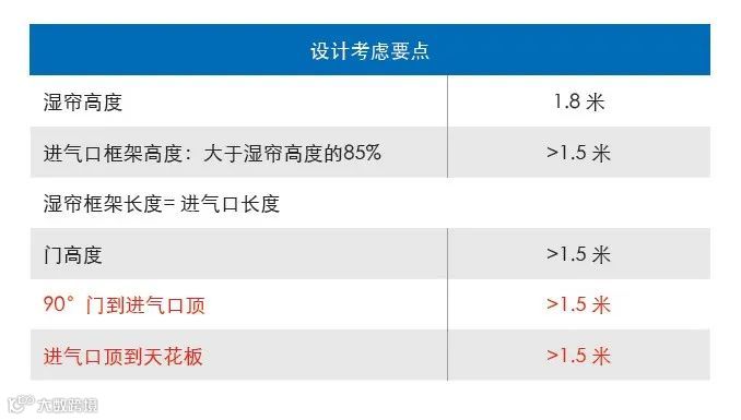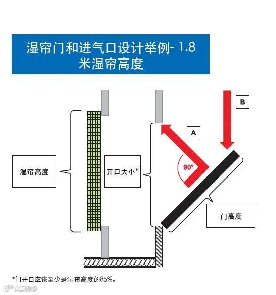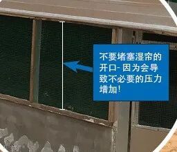 在湿帘前严禁放置任何建筑或遮蔽物,这些遮挡将导致压力上升。开口应该与湿帘面积匹配。参看如下图片;