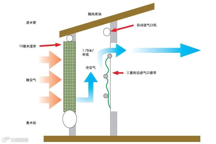 如果使用湿帘间的门,那么门的周边应该被密封完好。湿帘间的顶/天花板一定要密封好。