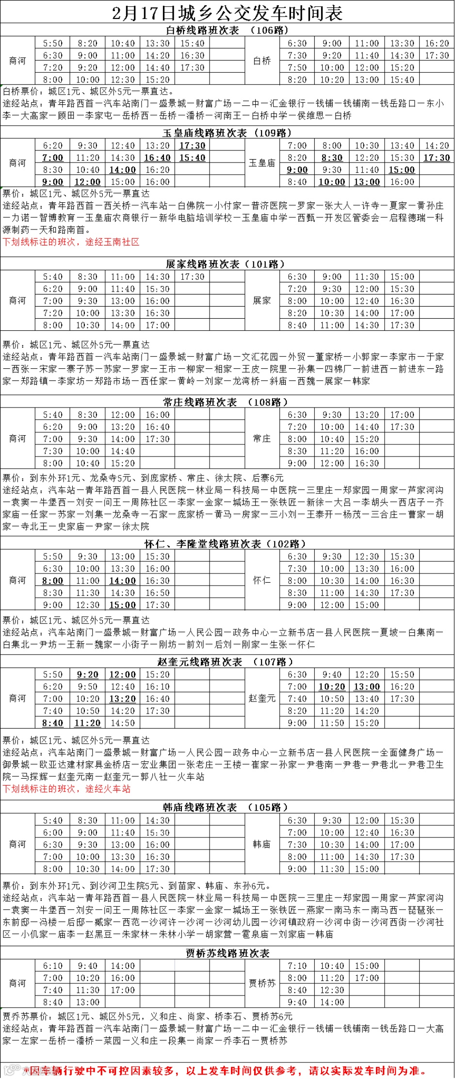 因学生放假,2月17日城乡公交班次时间暂时有所调整,望周知,请持续关注微信公众号【山商交运】&【商河县汽车站】,以最新通知为准。给您带来不便,深表歉意,敬请谅解!如有疑问,欢迎拨打4006860035咨询。
