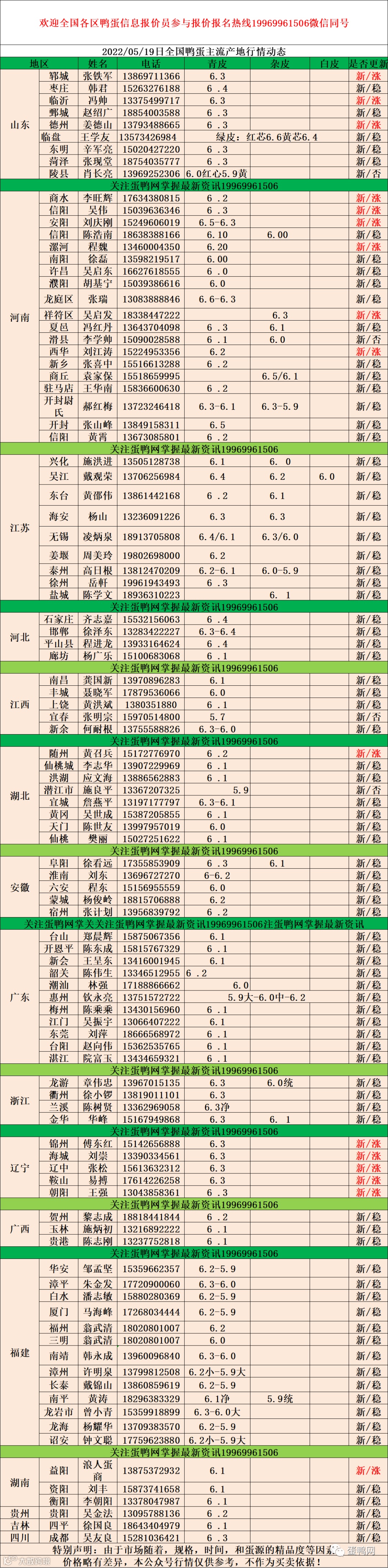 2022年05月19日鲜鸭蛋价格:初产至10个头6.1元,10个头至9个6.2元,9个头至大蛋6.3元(参考值)