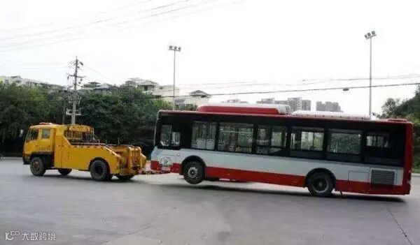 一是轻松应对陡坡路段,因为公交车多是城市道路运行,底盘偏低,且车身较长,如遇到陡坡路段,没有这条切线,车前轮上去了,“臀部”会在地上摩擦;现在的交通枢纽中心也是如此,如金沙公交站,公交车有时需要“爬楼”,在二楼、三楼发车。缓冲路段短,坡度较大,这条切线也能完美应对这种情况。二是如果公交车发生故障,需要用牵引车拖至维修地点,而牵引车需要将车头抬起,像这样: