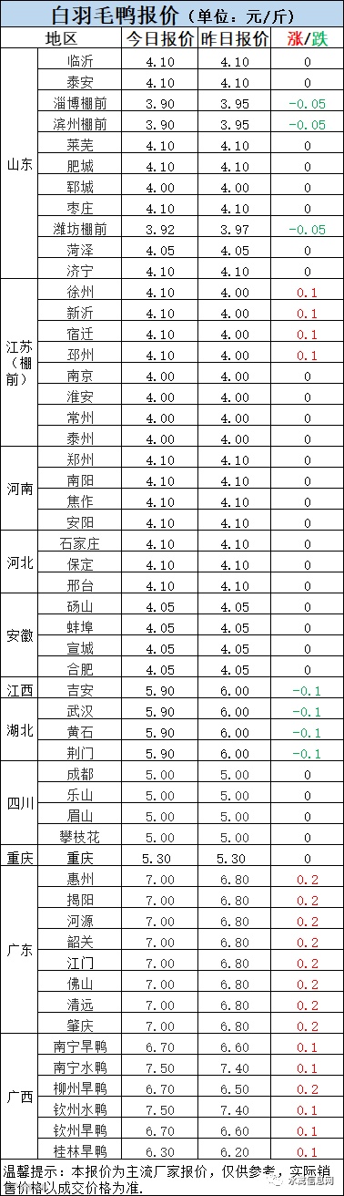 明日鸭苗报价北方上涨0.1元/羽,南方持稳。市场激烈拉锯,鸭价虽持续承压,但计划尚可,苗量与需求不断磨合,波动调整。