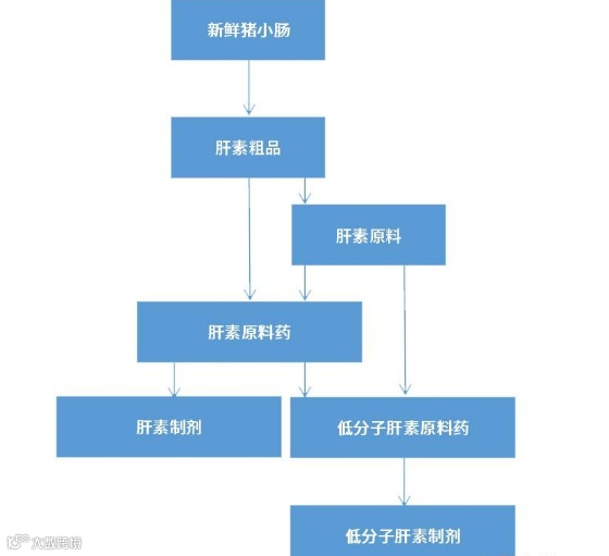 肝素的生产过程如下图所示,首先从健康生猪的猪小肠黏膜提取并制成固态肝素粗品,然后进一步加工提纯和精制得到肝素原料药。肝素原料药可以加工成标准肝素制剂,也可以进一步解聚得到低分子肝素原料药,再制备成低分子肝素制剂。